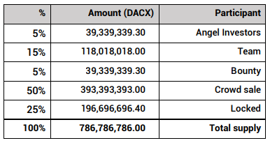 DACX offers affiliate and referral programs to increase brand awareness of products being offered at different levels of validation and withholding. The total number of DACX products is limited to a maximum of 5,000,000 tokens. Prizes will be distributed at the end of the campaign based on the completion period.