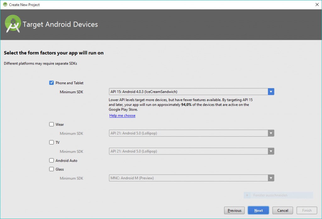 Also wählen wir nun aus, dass unsere App für alle Smartphones & Tablets ab API 15 verfügbar sein soll, damit haben wir ca. 94% aller Smartphones & Tablets abgedeckt!