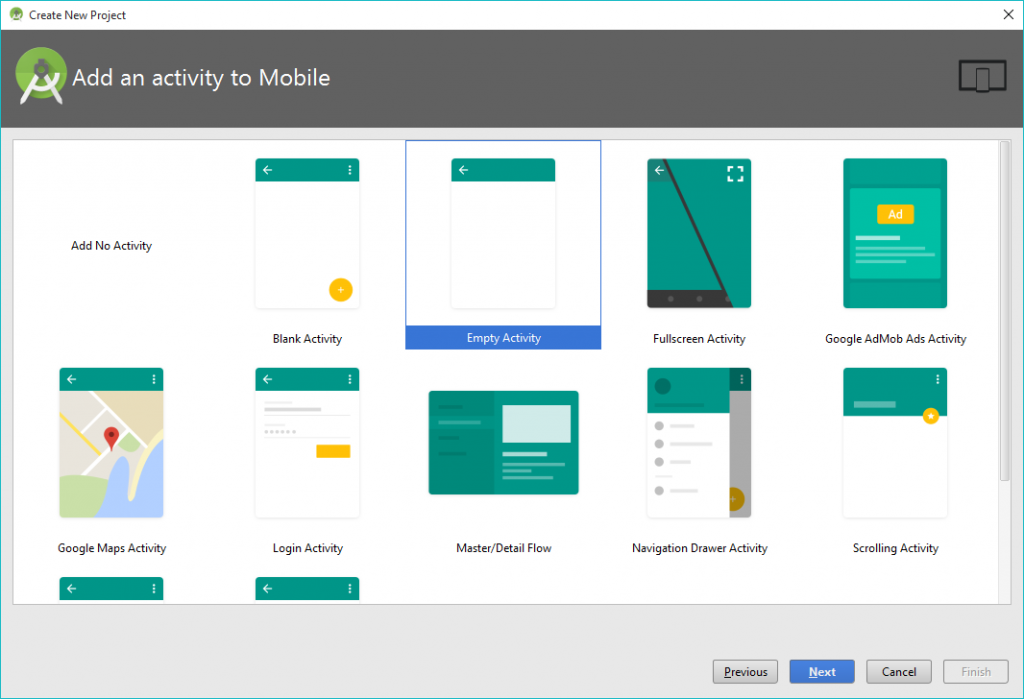 Hier wählen wir einfach eine Empty Activity (Leere Aktivität). Was eine Activity ist lernt ihr im nächsten Kapitel.