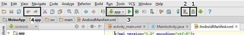 Bevor es im nächsten Tutorial um den Aufbau einer App geht und wir unseren ersten Code schreiben schauen wir uns erst einmal die obere Leiste an. Ich habe die für uns wichtigsten Felder markiert: