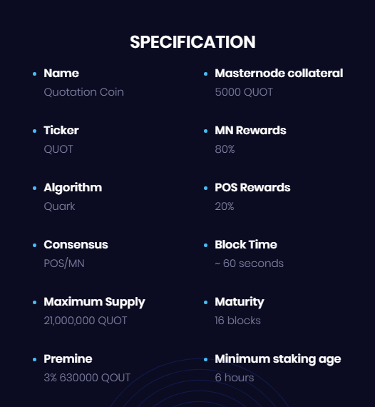 SPESIFIKASI QUOT Coin bisa cek table di bawah ini: