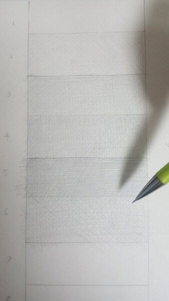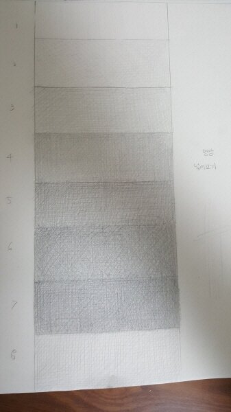 명암을 임의로 8단계로 나누어 주었습니다. 어두운 쪽부터 시작하는 것이 명암을 넣기에 더 편할 수 있지만, 그냥 밝은 쪽부터 시작했습니다. 색을 넣을 때는 일정한 힘으로 선들을 평행하게 그어줍니다. 가로, 세로, 대각선의 다양한 방향으로 겹쳐 선을 쌓아주겠습니다. 한 칸에 선을 그을 때는 되도록 중간에서 멈추지 않고 한 쪽 끝에서 한 쪽 끝까지 닿도록 그어주세요. 그러는 것이 한 칸의 색이 균일하게 쌓이는 데 도움이 됩니다.