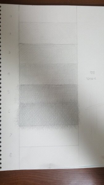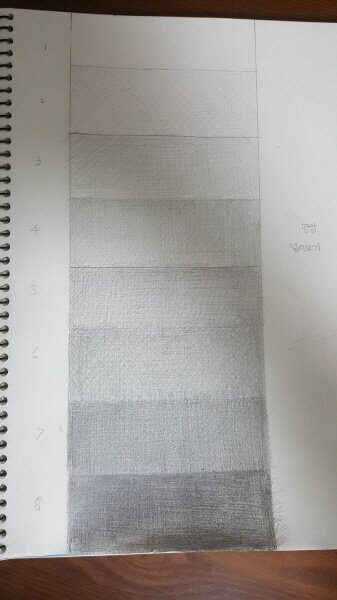 한 번 어두워지면 밝게 하기 어려우니 8단계로 도착할 때까지 조금은 소심하게 선을 쌓아주었습니다. 8단계를 확실히 어둡게 색을 쌓아주고 나서 다시 위로 올라가며 정리해줍니다. 선을 성글게 썼으므로 섬세하게 칠해가며 메꾸어 올라갑니다.