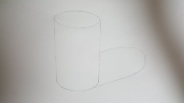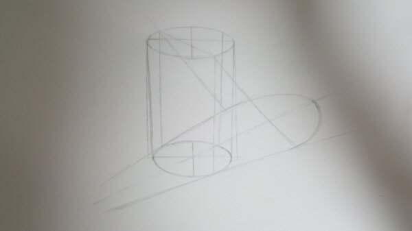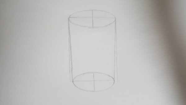 윗면부터 그려줍니다. 밑이 더 긴 십자를 그려 타원을 그려주세요(2번). 평행하게 내려오는 도움선을 그린 후 밑의 소실점을 의식하여 기둥을 그려줍니다(3번). 아랫면을 그리기 위해 다시 십자를 그려 타원을 그려줍니다. 이 때 아랫면이 윗면보다 동그랗기 위해서는 십자의 세로비율은 윗면보다 길어야겠죠!(1번+2번)
