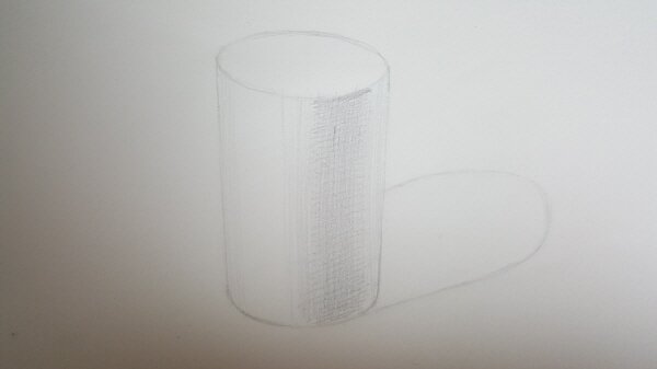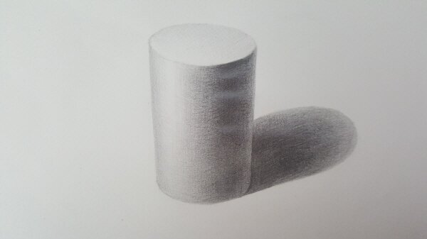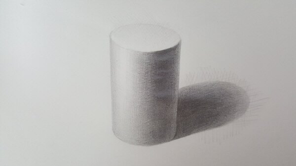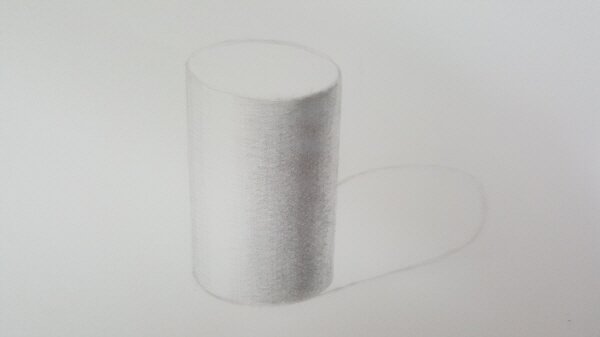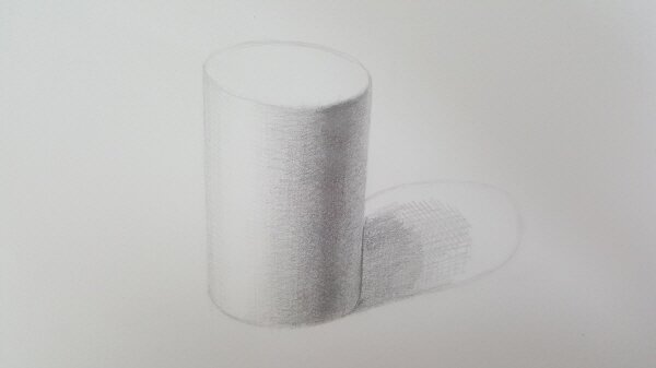 옆면부터 살펴보면 빛의 중앙에 위치하는 부분이 가장 밝고, 빛을 더 이상 받지 못하는 부분이 가장 어둡게 표현되겠네요. 그리고 가장 오른쪽은 반사광이 나타나겠군요. 한편, 빛을 많이 받고 있는 윗면은 가장 밝게 표현될 것입니다. 그림자는 원기둥과 가까울수록 더 어둡게 표현되겠죠.