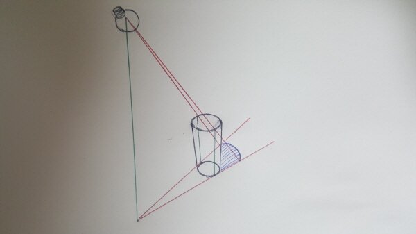 원기둥의 그림자가 생겨나는 모습을 볼까요? 다음과 같이 원기둥과 접하는 광원의 빛이 바닥에 닿아 그림자의 경계를 이룹니다.