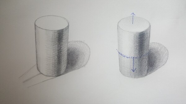 이 때, 그림에 저번 시간에 배운 공기원근법을 적용하면, 나로부터 멀어질수록 원기둥의 명암은 흐려지겠죠? 밝은 것은 멀어질수록 어두워지고, 어두운 것은 멀어질수록 밝아질 것입니다. 윗면은 파란 화살표를 따라 어둡게 표현해주고, 옆면은 파란 점선 아래로 명암 대비가 적게 표현해주세요.
