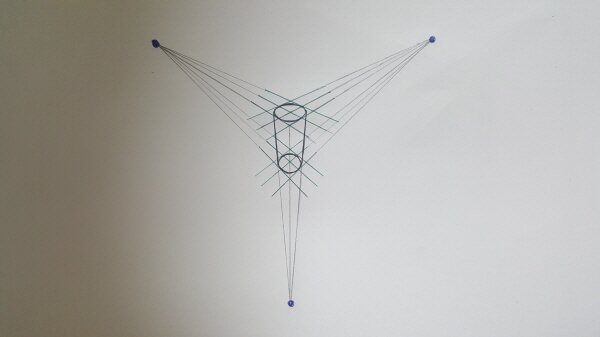 원기둥을 위에서 본다고 가정했을 때, 어떻게 표현할 수 있을까요? 원기둥의 원근감을 표현하기 위해 소실점이 3개인 3점 투시로 표현하면 다음 그림과 같은 형태가 됩니다. 이 형태만 기억해주시면 됩니다. :)