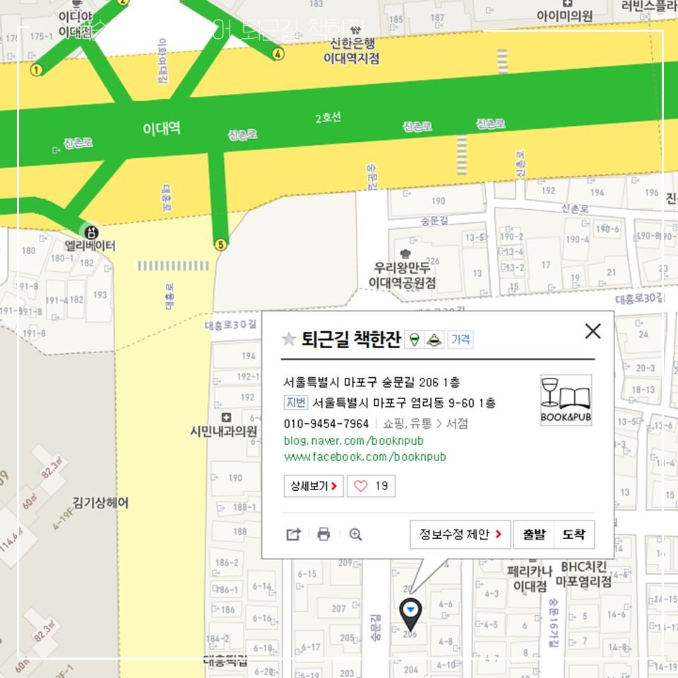 대학생 시절 하던 동아리 활동 때문에 이대에 자주 갔었습니다. (매우 좋은 동아리) 항상 이대역에 내리면 3번 출구로 내려 이대방향으로 곧장 걸어갔습니다. 그래서 그 반대편인 '염리동'이라는 곳에 뭐가 있는지 몰랐죠. '퇴근길 책한잔'이라는 독특한 서점이 그곳에 있다는 것을 알기 전까지는요.  오늘 소개해 드릴 책방은 바로 '퇴근길 책한잔'입니다. 정말 묘한 분위기, 독특한 책방 사장님이 있는 곳입니다.