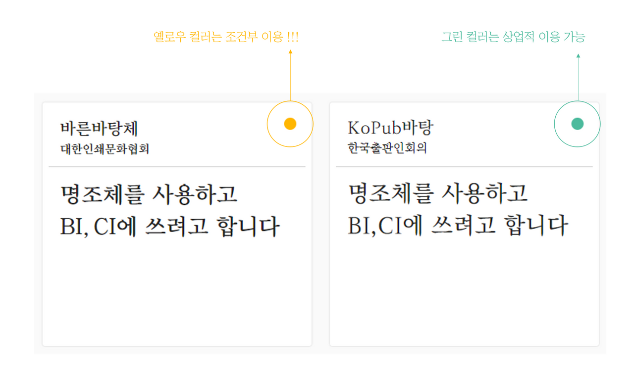 제가 체크한 화면을 보시면, 옐로운 컬러 표시가 있으면 조건부로 상업적 이용 할 수 있다는 뜻 입니다. 폰트를 클릭해서 어떤 경우에 사용 가능한지 자세하게 한 번 더 확인하셔야 하고, 그린 컬러가 뜨는 폰트는 상업, 비상업적 사용 모두 가능하다는 뜻이니 편하게 쓰시면 됩니다.