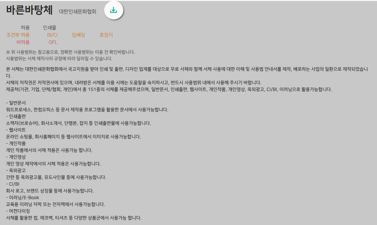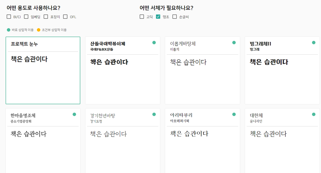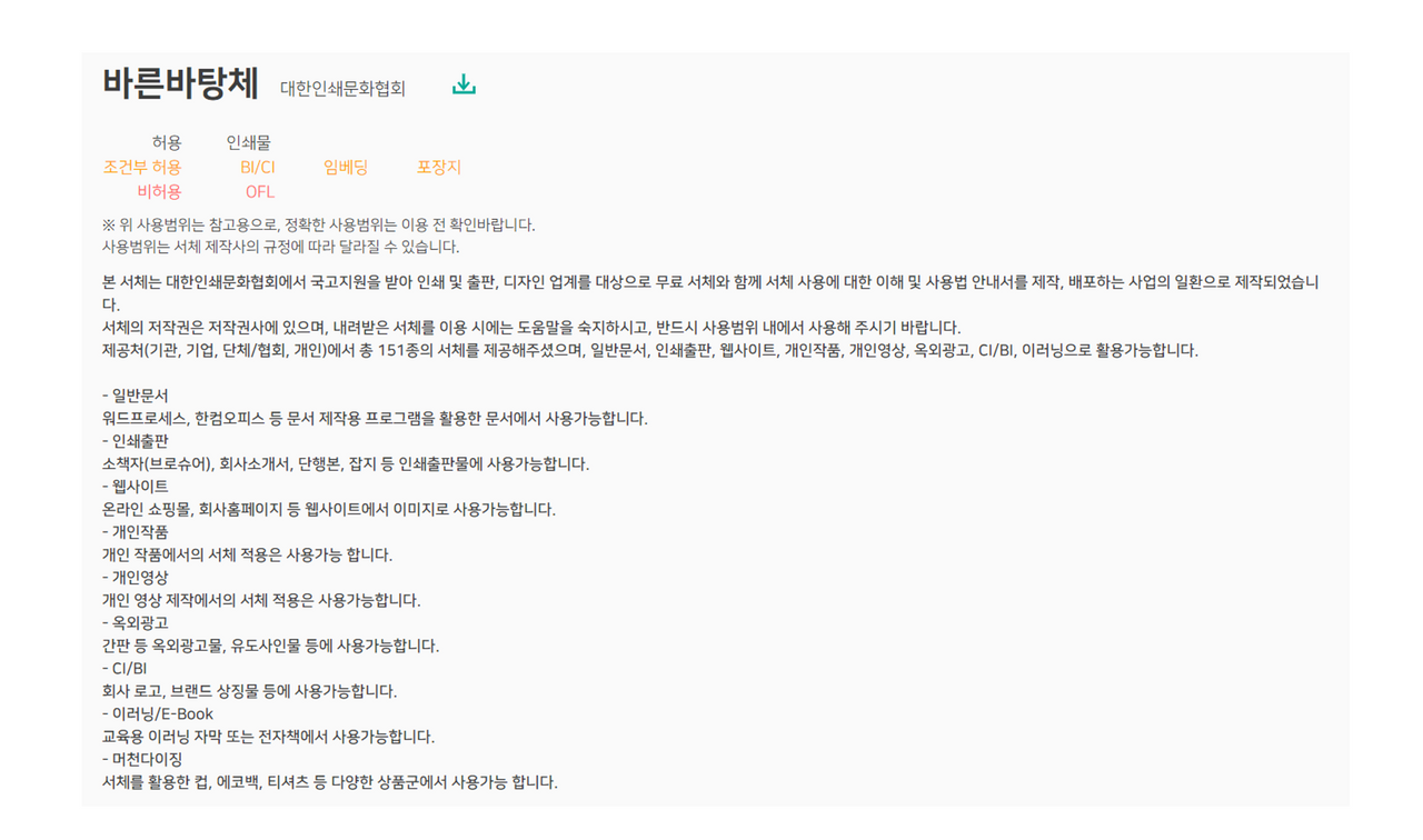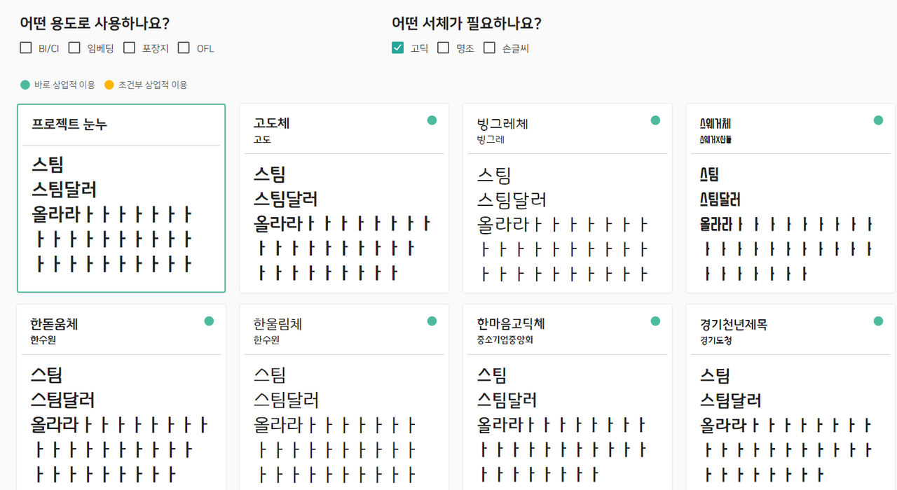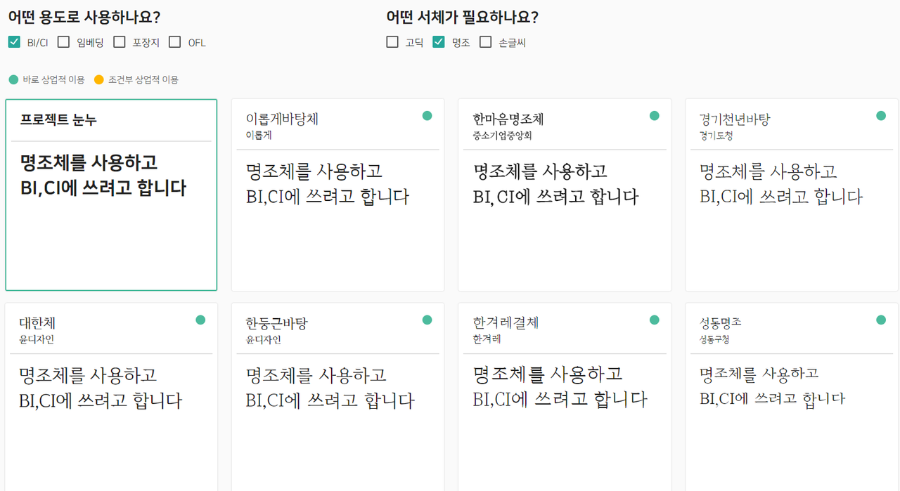 폰트를 어디에 쓰는지도 중요합니다. 총 4개로 분류했는데요. BI/CI, 임베딩, 포장지, OFL입니다. 어떤 폰트는 BI/CI에 사용 할 수 있지만 임베딩은 안 되는 폰트도 있습니다. 서체를 선택하고, 어떤 용도에 쓸지를 정하면 그에 맞는 폰트가 리스팅 됩니다.