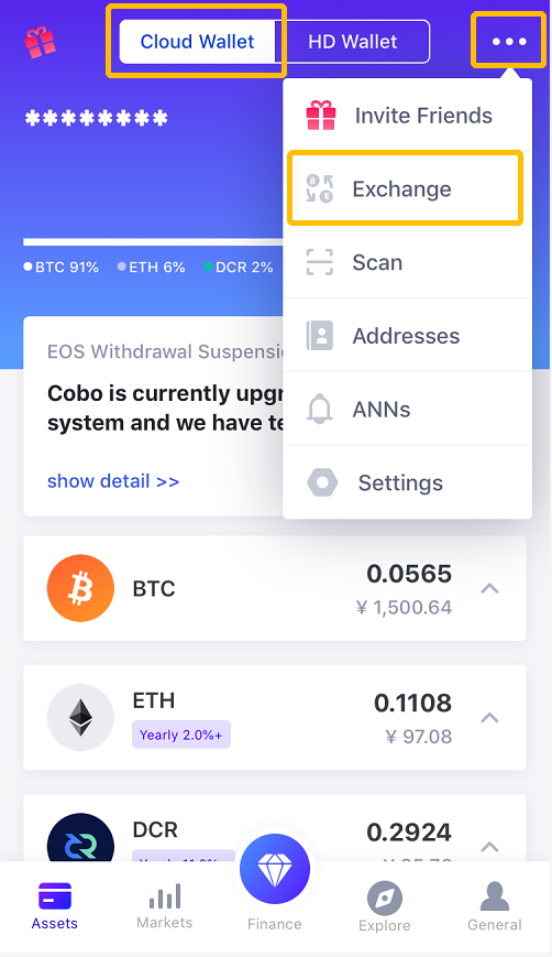 2. Нажмите «Финансы» ->> щелкните значок «Обмен» в верхнем левом углу.