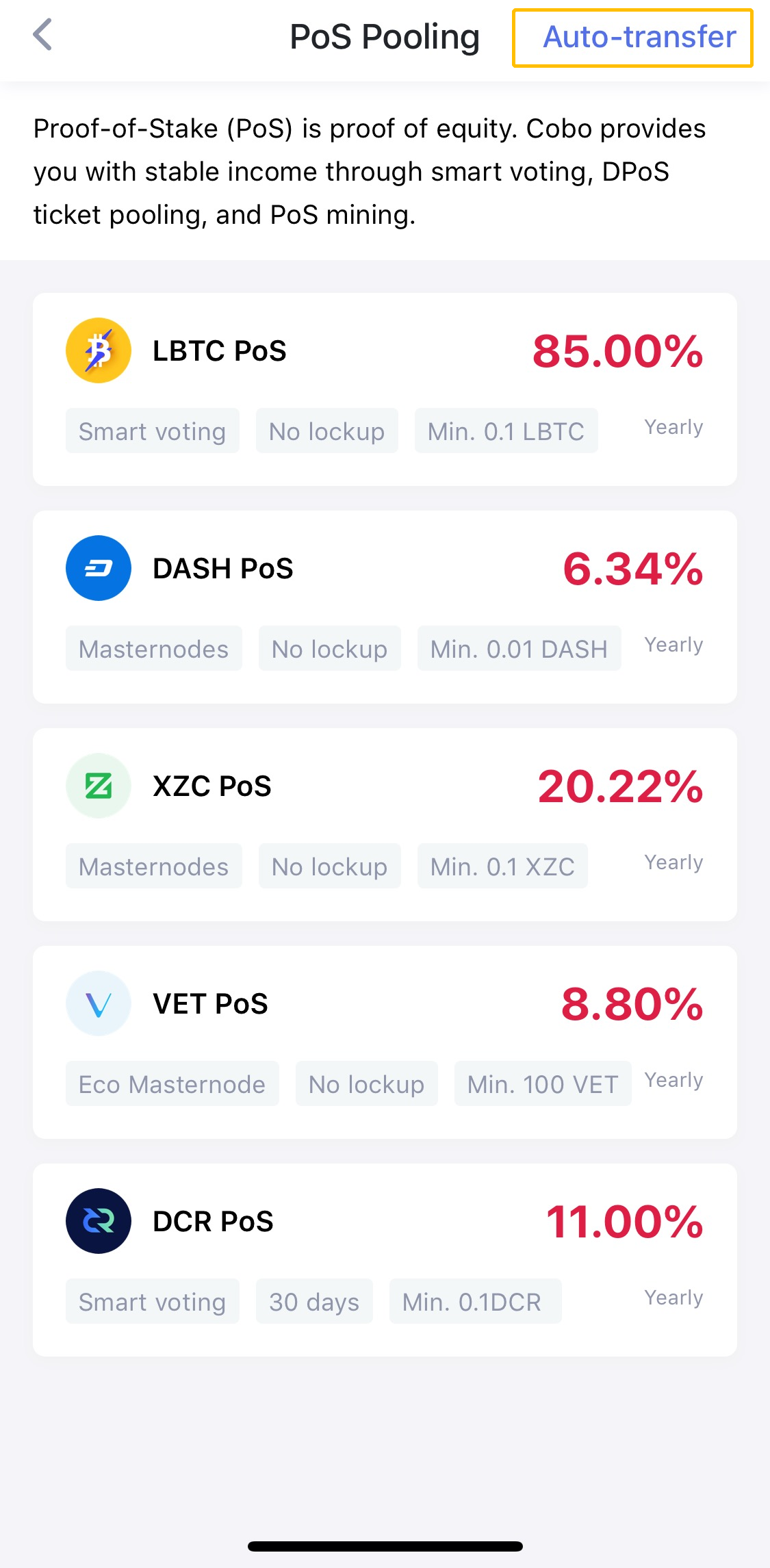 PoS является доказательством заинтересованности, Cobo может обеспечить стабильный доход с помощью интеллектуального голосования, пула голосования DPoS и майнинга PoS. Нажмите в правом верхнем углу, чтобы выбрать «Авто-перевод» и введите сумму, это легко работать!