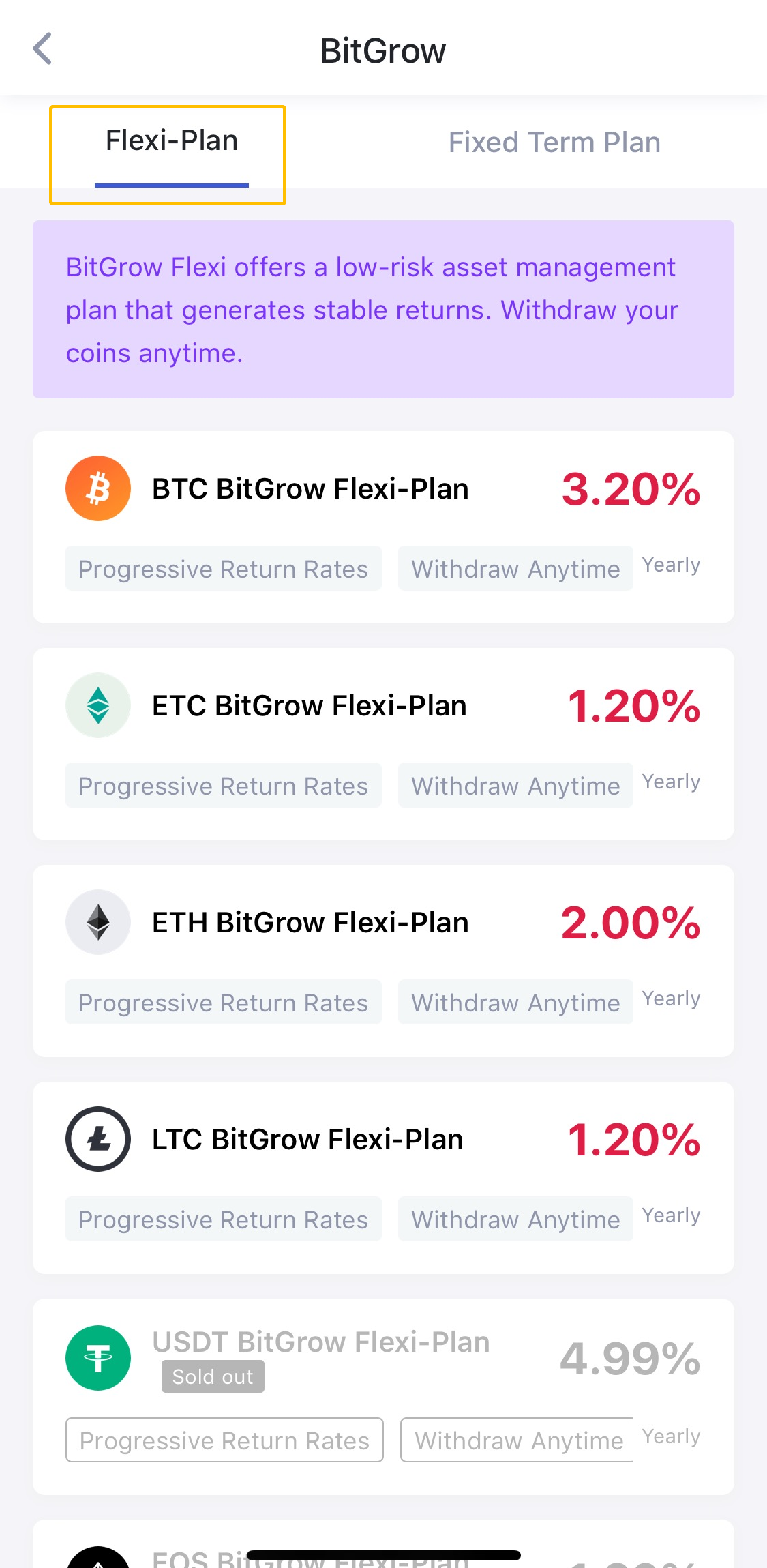 Bitgrow Flexi-Plan: персонажи и пользователи с низким риском и стабильным доходом и т. д. Могут снимать или вносить средства в любое время.