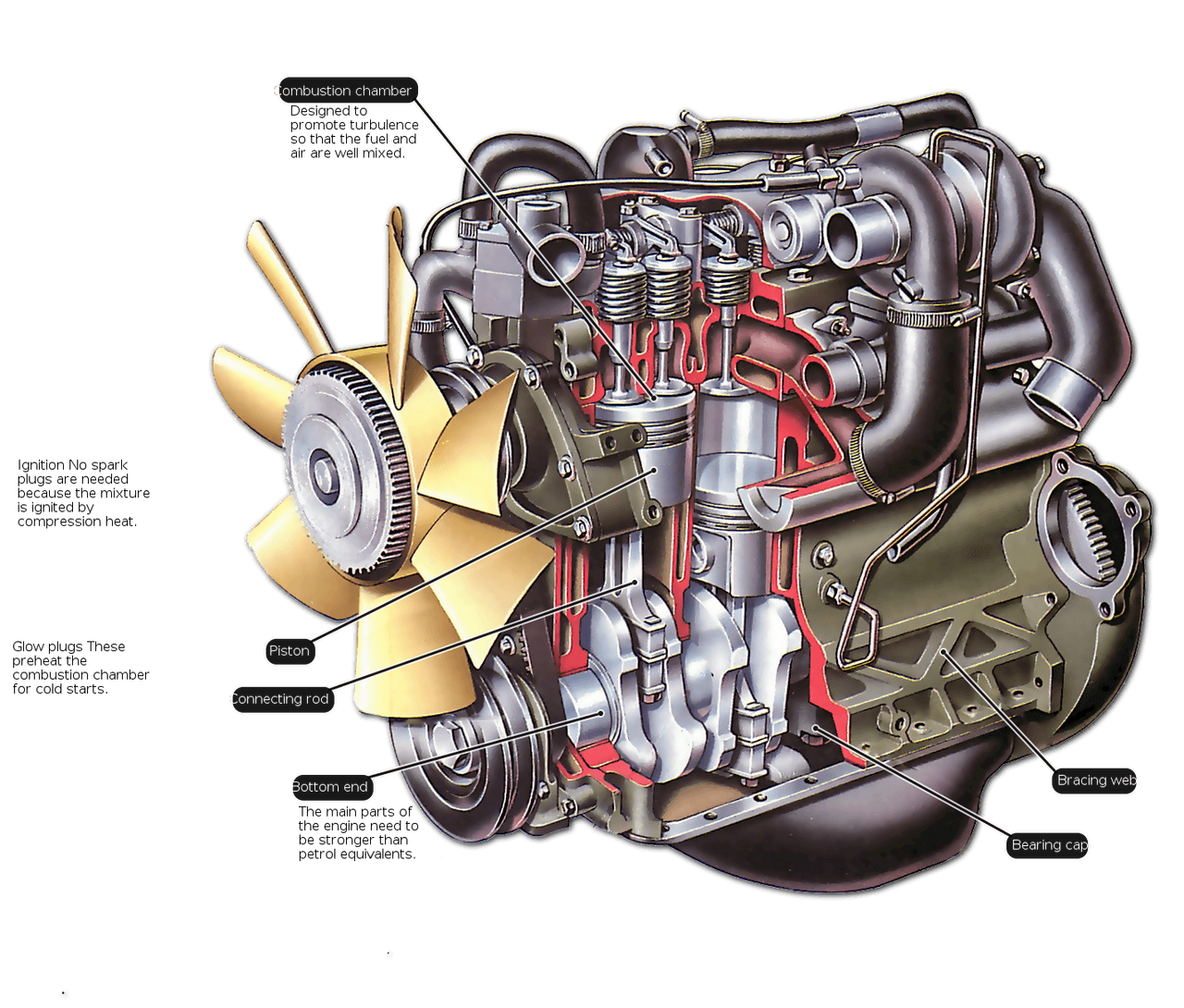 A diesel engine works by ignition of the mixture air-gas no spark. Temperature that starts combustion comes from the rise of pressure that occurs in the second engine time, compression. Diesel fuel is injected into the top of the compression chamber at high pressure, in such a way that it atomizes and mixed with air at high temperature and pressure. As a result, the mixture Burns very quickly. This combustion causes the gas contained in the Chamber to expand, pushing the piston down. Connecting rod transmits this movement to the crankshaft, which spins, transforming the linear motion of the piston into a rotational movement.