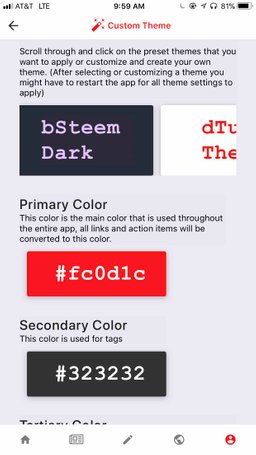 jm90mm(25)•in #busy•2848 days agobSteem has joined the dark side!! Dark themes and more customizations now available!Dark theme is now available on bSteem. Choose any one of the preset themes in the settings screen, or customize even further by picking out the different color ...2312$13.13jm90mm(25)•in busy•2848 days agobSteem has joined the dark side!! Dark themes and more customizations now available!Dark theme is now available on bSteem. Choose any one of the preset themes in the settings screen, or customize even further by picking out the different color ...2312$13.13