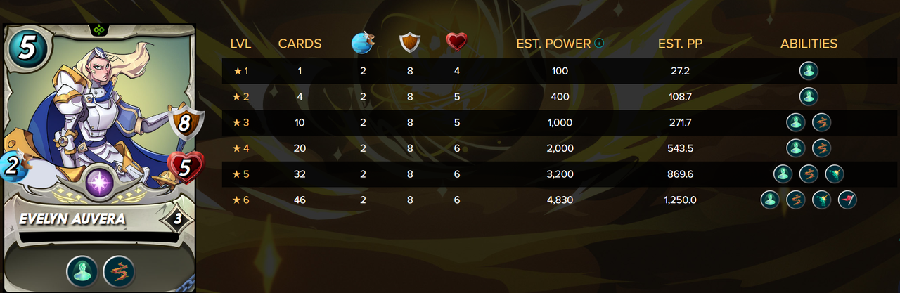 I really feel that Evelyn Auvera is an underrated card, I don´t see too much players using her often, at least against me I find very few opponents using her, it may be because they don´t have at her max level and think is not that good at low levels, but it is pretty decent just in level 3, putting her in the back may make you win the game if the opponent use melee sneak attack monsters, also with a Weapons Training you will make a lot stronger this card, currently one of the best option of Life splinter is Aves Sturgis that give 3 magic damage, her immunity ability not only will make her a pretty good choice on the Noxious Fumes ruleset it also help against the sneaks units with poison attack like Uraeus , now if you manage to have her in max level you will have a lot more interesting options with her Inspire ability, making melee teams a lot stronger. She is also very strong on Equality ruleset since she have lot of armor and not so much health.