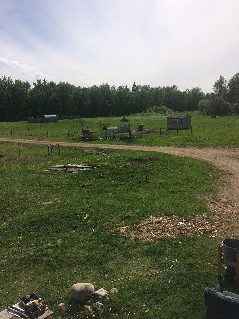 A few blogs ago I had gone on to our roof and taken some pictures of our domain. I have done that again to show the difference from the winter time to now. So here is the dugout. It is now dry and it has been dry for a couple of weeks now. The ducks are not happy about this. They miss swimming in it.