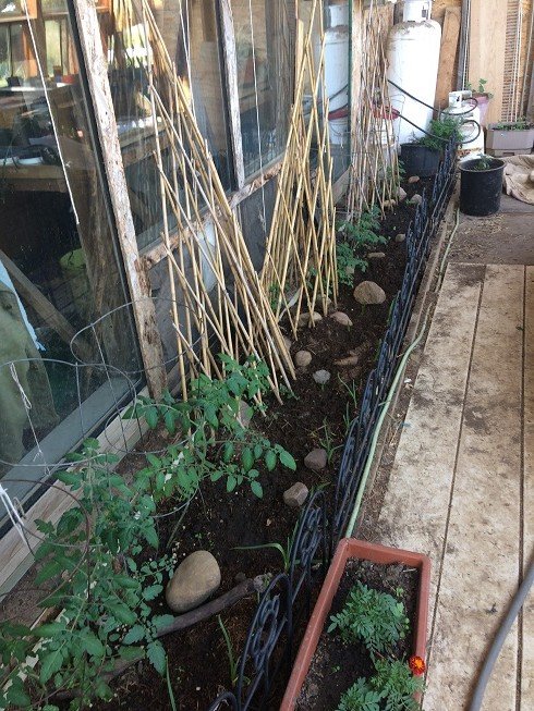 The roof is not completely on the back wall so we have decided use the atrium and other places for our tomatoes, cucumbers, kale, peppers and lettuce. I have had to remove the strawberry patch. I was able to salvage some of it but not all of it.