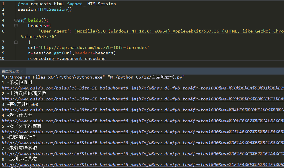 自从学了Python了之后,不停的在练习,今天就拿百度练下手爬取实时热点,需要用的库有requests_html 非常的简单! 程序运行结果如下图: