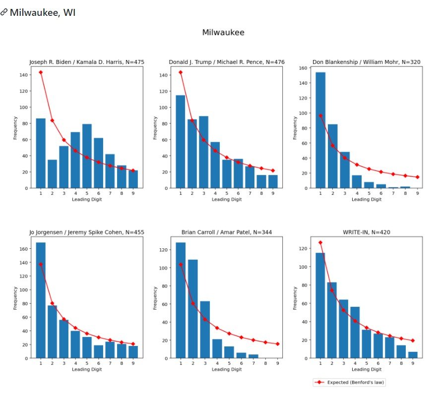 这是威斯康星州——也就是第一个翻蓝的摇摆州——的一个城市投票数据的本福德验证,横轴是出现在首位的数字1-9,蓝色柱状图是数字出现在首位的频率,红色曲线是贝福德期望曲线,就是对比标准,可以看到川普和其他候选人的数据基本符合红色曲线,也就是1出现在首位的次数最多,后面的数字出现在首位的次数依次减少。而拜登的数据就明显偏离了,除了1之外,出现在首位最多的数字竟然是5。这是拜登的选票有人为干预的强烈信号。当然这种数学验证并不能作为拜登舞弊的确凿证据,只能作为参考。