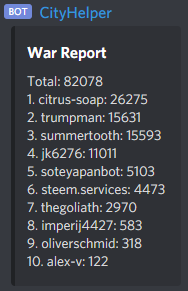 cityhelper(25)•in #dcity•1800 days agoThis is WAR! Official dCity Presidential Contest.Hello dCitizens, this is your president speaking. As of right now, I am officially declaring a state of war. This is a donation war, featuring @homeless-city (r...9cityhelper(25)•in dcity•1800 days agoThis is WAR! Official dCity Presidential Contest.Hello dCitizens, this is your president speaking. As of right now, I am officially declaring a state of war. This is a donation war, featuring @homeless-city (r...9