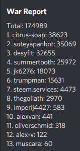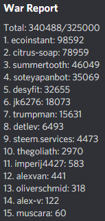 cityhelper(25)•in #dcity•1794 days agoWar Update 5We almost didn't make it yesterday, but @summertooth came in at the last second and met the quota. Then @ecoinstant filled out today's goal will room to spare. ...1cityhelper(25)•in dcity•1794 days agoWar Update 5We almost didn't make it yesterday, but @summertooth came in at the last second and met the quota. Then @ecoinstant filled out today's goal will room to spare. ...1