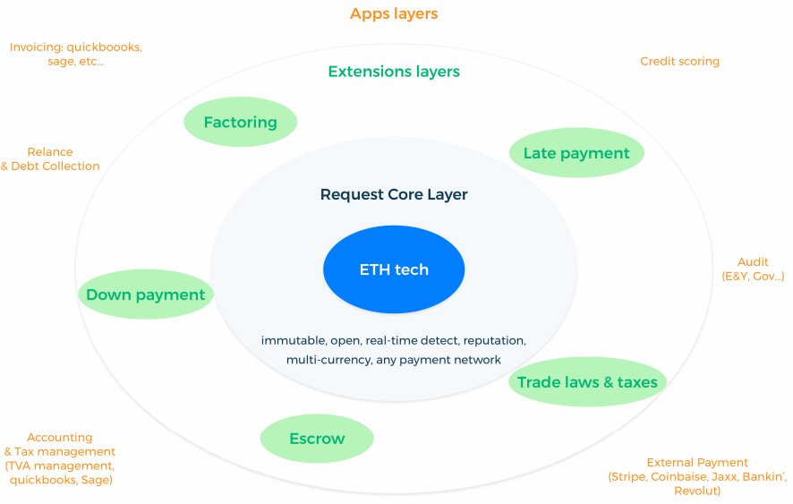 Her iyi sistemin sağlam bir temele ihtiyacı vardır ve Çekirdek Katman Request Network’ün temelidir. Ethereum ağının üzerine kurulu olduğu için, herhangi bir ERC-20 tabanlı faturayı tespit edebilmektedir. Ayrıca, diğer fatura türlerini de oracles kullanımı yoluyla entegre etmiştir. Temel ödemeler Çekirdek katmanında yönetilir. Basit faturalama akıllı sözleşmelerle yapılır ve ödemeye göre takip edilir.Uzantılar Katmanı