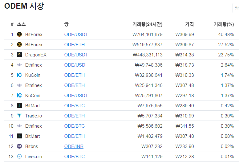 오뎀이 상장돼 있는 거래소는 비트포렉스, 이더파이넥스, 쿠코인 등입니다.