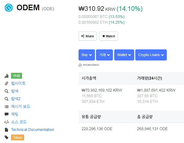오뎀은 2019년 4월 29일 현재 코인마켓캡 85위입니다. 현재 310원 정도의 가격에 거래되고 있네요. 시가총액은 700억원이고, 총 발행량은 2억 6천만개입니다. 이 발행량은 마음에 드네요.