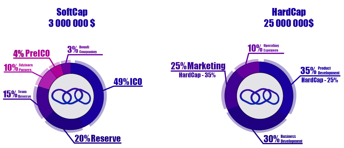 - 25% Marketing and PR including the cost of advertising, media and the creation of local communities to increase the number of users (if we reach HardCap more than 35%)
