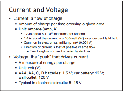 Electric current is a flow of charge, which is measured in amperes (A). Voltage is the push that drives current through a wire or an electrical or electronic device. It's a measure of the energy per charge, and its unit is volt (V)