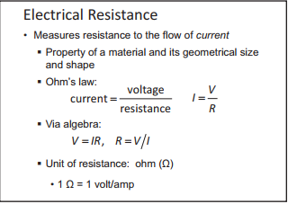 Typically, conductors have resistance; they don't let current flow easily. The resistance of a particular component is a function of both the material it’s made of and its geometrical size and shape. There’s a simple relationship, known as Ohm’s law, between current and voltage: current = voltage/resistance, or I = V/R. The unit of the resistance is the ohm. Ohm's law can be written in three different forms, but they’re all equivalent: I = V/R, V = IR, or R = V/I.