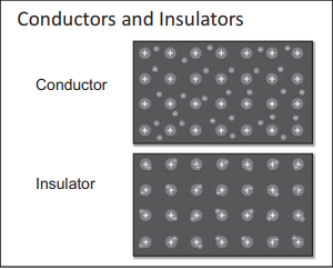 We can talk about free charges as a way of distinguishing two kinds of materials: conductors and insulators. An electrical conductor is a material containing charges that are free to move. In metals, the most common conductors, those free charges, are electrons. Typically, one or two electrons at the outermost periphery of the metal atoms become free, not bound to individual atoms. They’re free to move throughout the metal, and that’s what makes the material a conductor. An insulator is a material lacking free charges. In an insulator, all the individual electrons are bound tightly to the atoms and can’t be moved.