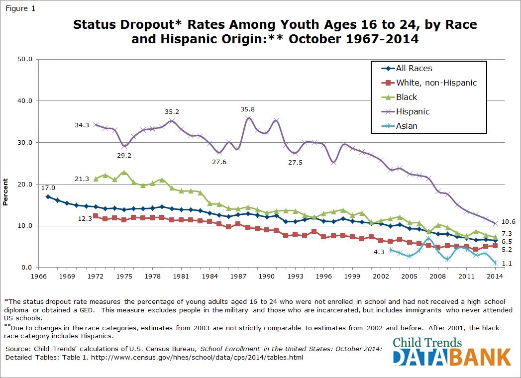 The next graphic shows dropout percentages in various ethnic populations over time from 1966 to 2014. Notable is that all populations have experienced more than a 50% decrease in dropouts. How is it possible to have reduced dropout rates if achievement in reading, math and science is net negative since 1970? There are certainly other contributing factors, but it appears relatively clear that educational standards have decreased significantly over time.