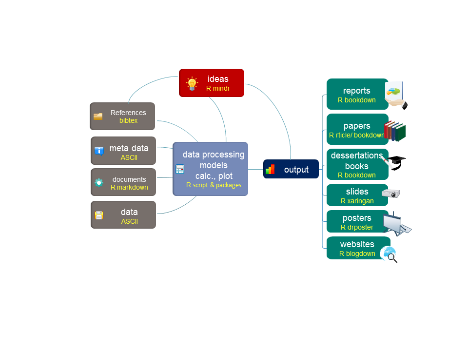 Weeks ago, I gave a short training course at one of the top institutes in the world. The course was called 'R, Open Science and Reproducible Research', abbreviated as ROSS. It was given to the academic researchers who were interested in R and reproducible research. The R markdown family, including 'rticles', 'bookdown', 'xaringan' etc., were introduced. The audience were excited in the course. They felt, however, confused after the course by using these packages on their own work. It is not easy to connect their own work with the R Markdown ecosystem.