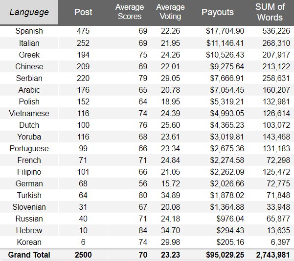 Time flies! It was exactly a year ago since we re-opened the translation category with Utopian. It's been an interesting experience and overall we showed that we can use the Steem blockchain to do some good. We have several people to thank for their trust, support and dedication. Together we supported open source projects by translating a whopping 2.7 million words! We also distributed thousands of dollars of incentives to our collaborators. The table below shows the contributions from each team: