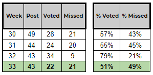 Since the votes are limited, now more than ever it's crucial that we ensure that contributions are voted fairly. It's inevitable that within the teams, relationships arise, that is actually a good thing. We understand that the LMs want to reward their team-mates for their good work, but please try to be fair with the scores and not too generous. We are trusting your common sense on this.