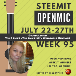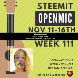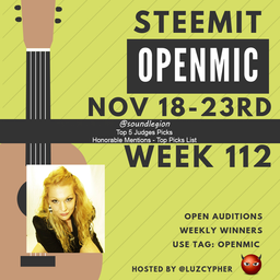 soundlegion(25)•in #openmic•2612 days agoOpenMic Week 112 - @soundlegion Top 5 Judges Picks - Honorable Mentions - Top Picks ListSee all who played this week on Steemit's Official OpenMic https://steemit.com/openmic/@luzcypher/steemit-open-mic-week-112-see-who-played-open-mic Join us Next...10211$0.72soundlegion(25)•in openmic•2612 days agoOpenMic Week 112 - @soundlegion Top 5 Judges Picks - Honorable Mentions - Top Picks ListSee all who played this week on Steemit's Official OpenMic https://steemit.com/openmic/@luzcypher/steemit-open-mic-week-112-see-who-played-open-mic Join us Next...10211$0.72