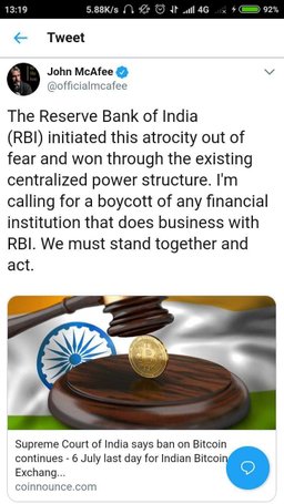 deva8408(25)•in #cryptocurrency•2749 days agoJohn McAfee fires shots at RBI for not allowing the banks to deal with Bitcoin (BTC)Hello friends, In this blog I would like to tell you how John McAfee warned RBI for not allowing to deal with bitcoins and how some scammers are making their be...66$0.00deva8408(25)•in cryptocurrency•2749 days agoJohn McAfee fires shots at RBI for not allowing the banks to deal with Bitcoin (BTC)Hello friends, In this blog I would like to tell you how John McAfee warned RBI for not allowing to deal with bitcoins and how some scammers are making their be...66$0.00