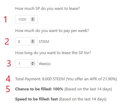 After deciding which account to lease for (you don't have to only lease for yourself, you can also gift a SP delegation to a friend!) and which account to pay from, you're asked to choose how much SP you want (1), what you're willing to pay per week (2), and for how many weeks you want to lease for (3).
