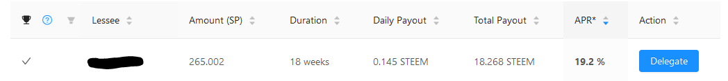 You can see the whitelist status of the person requesting the lease (checkmark to the left), their Steem account name, the amount of SP requested, the lease duration, the nett daily payout, the total payout, and the projected APR.
