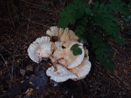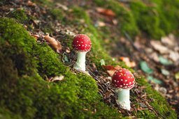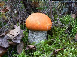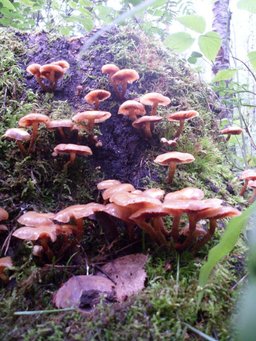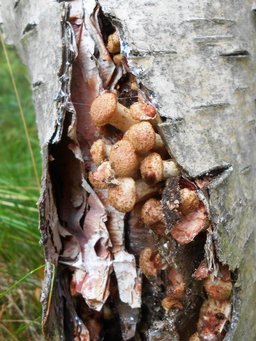 On the balance beam on birch, moss growing fungus Trametes silky ....