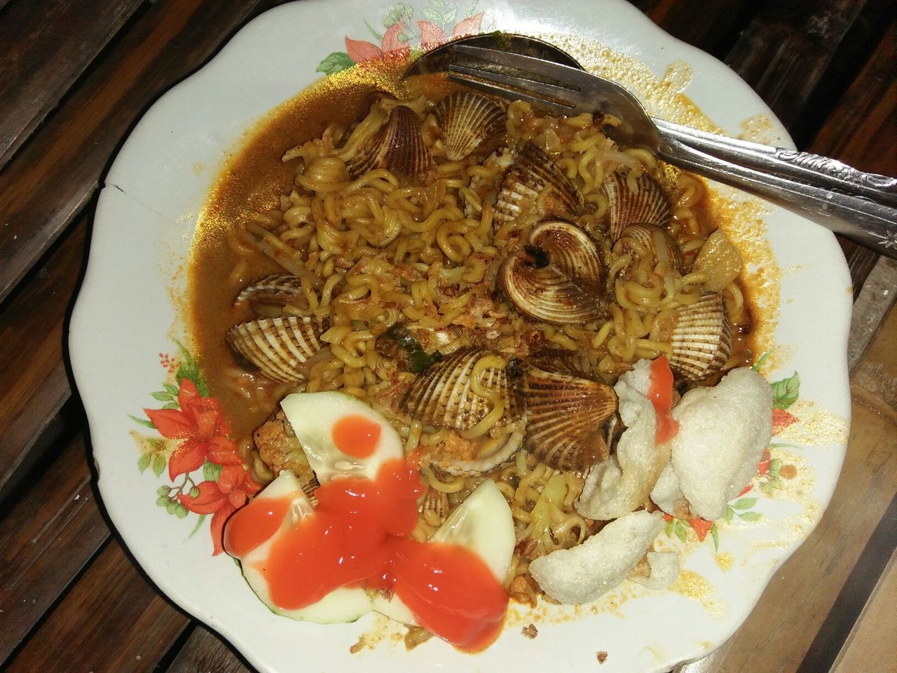 Menikmati mie kerang sambil santai