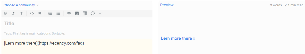 Ecency allows users to create a links which lead to other content on the Internet, and those that redirect someone to another profile within the site.