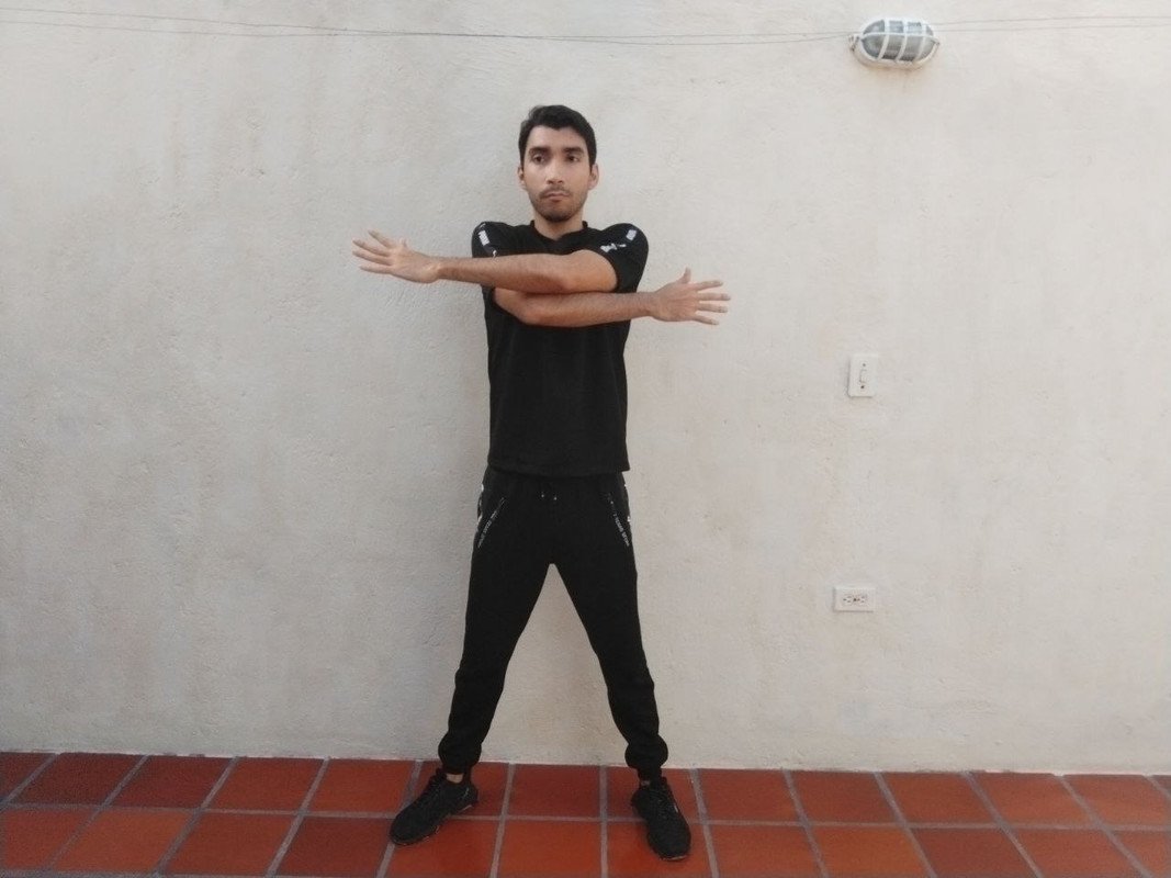 Continuando con los brazos a la altura del pecho, pondremos en movimiento precisamente todos los músculos de esa zona (Pecho, espalda y hombros), cruzaremos los brazos llevándolos en dirección al otro, como simulando un abrazo. Personalmente me gusta incluir este cuando es día de pectorales.