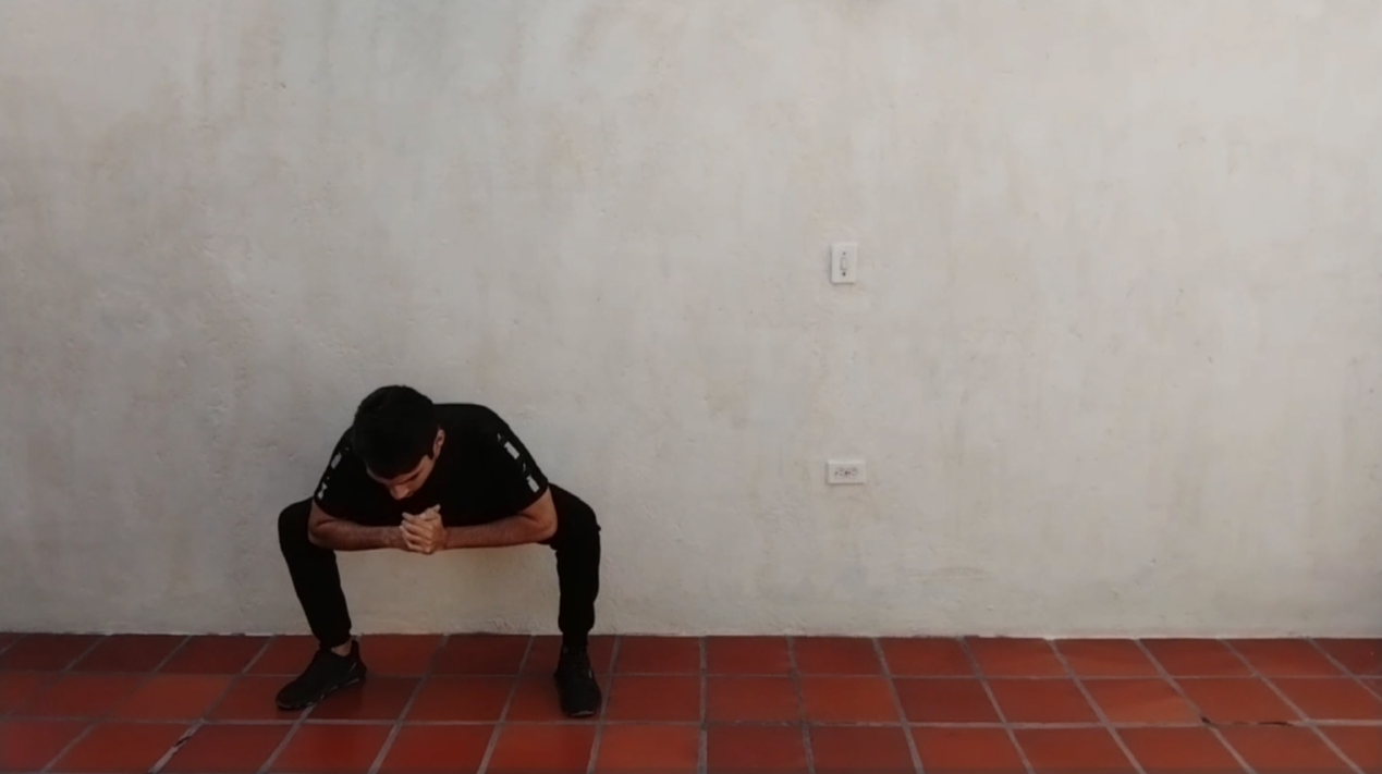 A continuación nos colocaremos en posición de cuclillas, separaremos bien las piernas ayudados con nuestros codos, estos empujaran hacia afuera o laterales y con nuestras piernas ejerceremos una pequeña fuerza hacia adentro, esto hará que los músculos de los glúteos y aductores se activen.