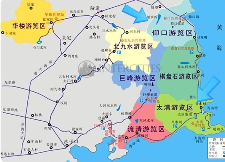 위에서 볼 수 있듯이 라오산은 7개의 풍경구로 나누어져 있으며 그 면적은 서울시의 0.8 배에 달한다.  롸??
