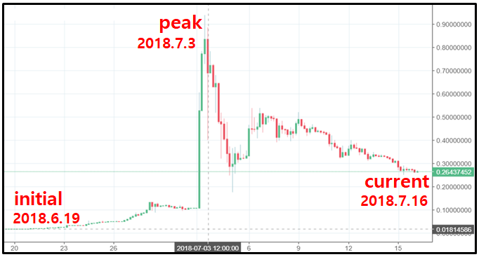 그림1에서 램의 피크 가격은 메인넷 런칭 당시의 초기 가격 대비 약 55배 상승했으며, 놀랍게도 이것은 단지 14일 동안 발생한 것입니다. 그리고 만일 EOS의 가격을 8달러(9,000원)로 가정할 경우, 런칭 후 약 한 달 후인 2018.7.16일의 램 1GB 가격은 약 2백만 달러(약 22억 원)로 너무 높습니다.