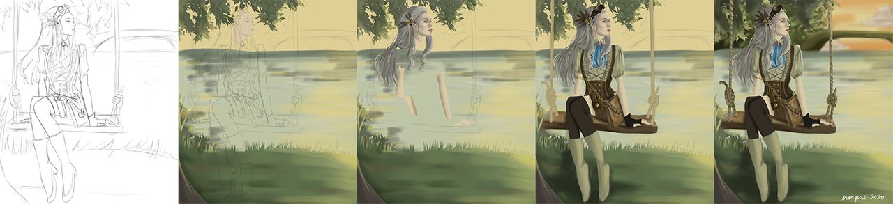 The drawing was inspired by a bunch of ideas put together. I made a Pinterest board to cite all these sources of inspiration and references. I was supposed to make the drawing more "steampunky," but I actually have another WIP that I think follows through what steampunk looks like.